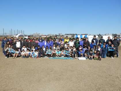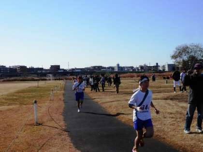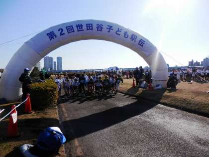 二子多摩川の河川敷で第2回子ども駅伝が開催されました。12月と思えない暖かさと抜けるような青空のもとでした。明正小学校6年生9名・5年3名は、砧中、砧小、山野小の4校の仲間と「チームたぬき24」のメンバーとして参加しました。7チームに分かれどのチームにも4校の子どもたちが入る編成をしました。小学生は1キロメートル、中学生は2キロメートルを走り、中学生4人と小学生6人で襷をつなぎました。