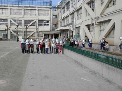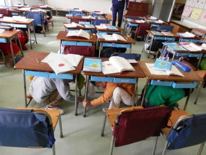 全校に「避難訓練、地震が発生しました。」という放送が流れると、子どもたちは一斉に机の下に入り、安全確保の姿勢をとります。その後、放送の指示に従い、担任の先生とともに校庭へ避難します。1年生は一階の教室なので、直接校庭に出て、すぐに並びます。