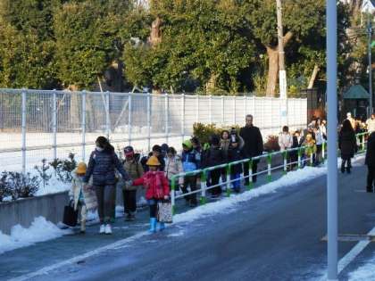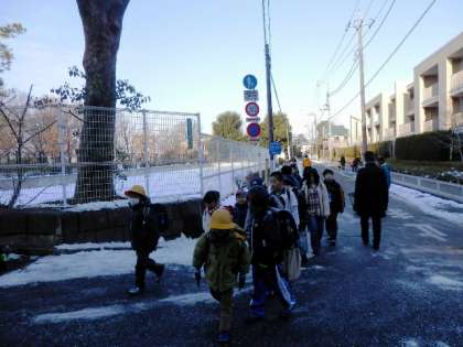 成人の日に降った雪が道路の隅に残っていたり、うっすらと凍っていたりしています。低学年の子が、高学年の班長さんに手をひかれて登校していました。