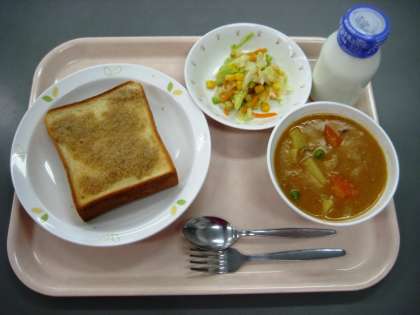 セサミトースト ポークシチュー コーンサラダ 牛乳