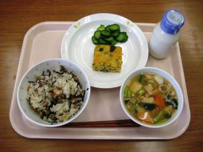 豆入りひじきごはん 卵焼き きゅうりの一塩 豆腐汁 牛乳