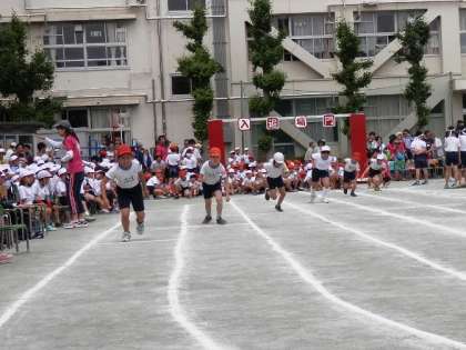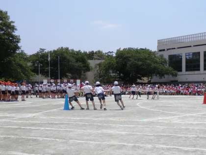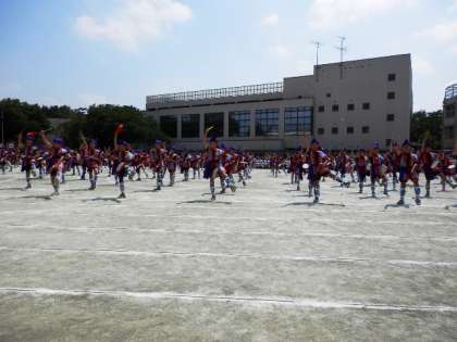 運動会・4年生といえばエイサーです。衣装を身にまとい、かけ声とともに始まります。動きに合わせてたたく太鼓も、しっかりそろって鳴り響きました。