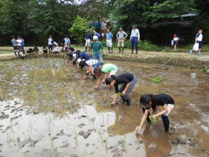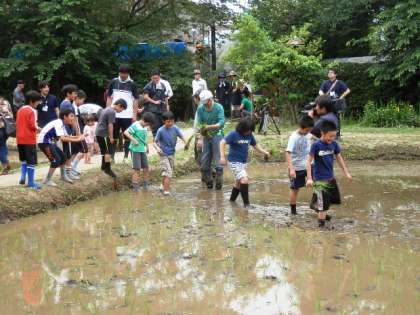 社会科の学習の一環として、田植え体験に取り組んでいます。秋には、稲刈りも予定しています。