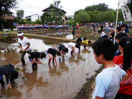 次太夫堀公園では、毎年この時期に近隣の小学校、幼稚園、保育園の児童・園児による田植えを実施しています。明正小も毎年参加させていただいている催しです。