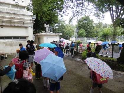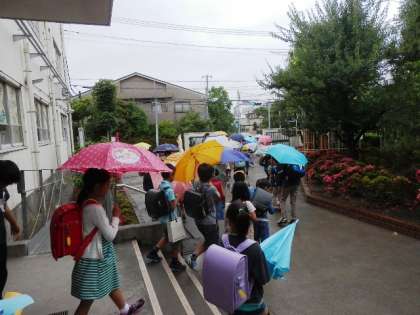 おはようDayで登校している班での集団下校です。班長さんを先頭に担当の保護者の皆さんとの下校です。雨の中でしたが、安全に気をつけて下校できました。