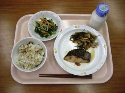 豆ごはん あじの南蛮焼き きざみ昆布の五目煮 野菜のごまだれかけ 牛乳