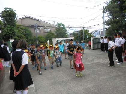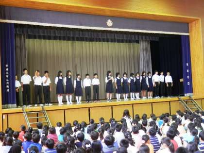 明正小学校出身の砧中生が朝のあいさつ運動に来ました。顔や名前を知っているお姉さんやお兄さんもあり、元気挨拶したり、手を合わせたりしていました。土曜朝会にも出てくれて、生徒会長の挨拶もありました。