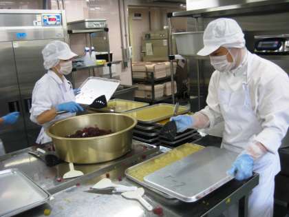 2枚目の写真は、あじさいゼリーを作っているところです。あじさいの花をイメージして、3色のゼリーを角切りにして作りました。味は、ぶどう・みかん・りんごです。