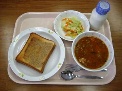 セサミトースト トマトシチュー キャベツサラダ 牛乳