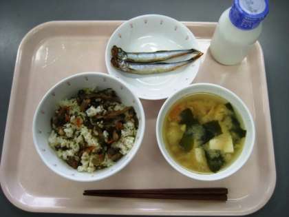 豚肉とごぼうのごはん みそ汁 焼きししゃも 牛乳