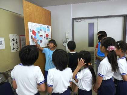 安全マップ作りのまとめです。学区域内を回って、自分たちの目で確かめたことをもとにマップをつくり、発表会をしました。今日は土曜授業だったこともあり、保護者の参観もあり、盛会となりました。