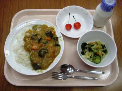 夏野菜カレーライス わかめサラダ さくらんぼ 牛乳
