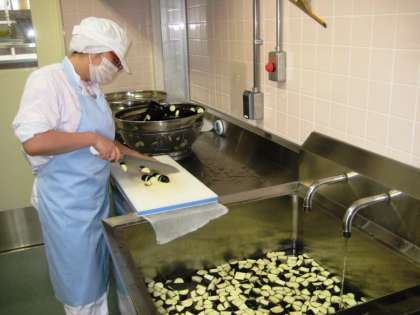 2枚目の写真は、夏野菜カレーのなすを切っているところです。太陽の光をいっぱい浴びて育った夏野菜はビタミンが豊富です。夏野菜をたくさん食べて、暑い夏を元気に過ごしましょう。