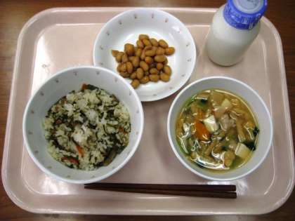 豚肉とごぼうの混ぜご飯 牛乳 吉野汁 ぶどう豆
