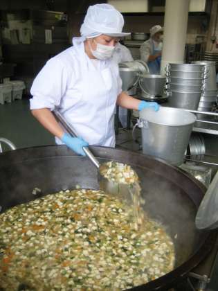 2枚目の写真は、吉野汁をクラスごとに配っているところです。吉野汁の小松菜は世田谷区宇奈根の農家から直接届けてもらったものです。地元で生産されたものをその土地で消費する「地産地消」です。