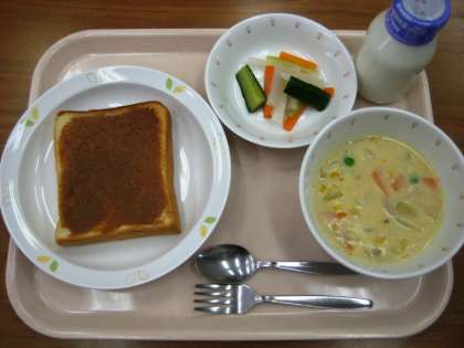 きな粉バタートースト クリームスープ ピクルス 牛乳