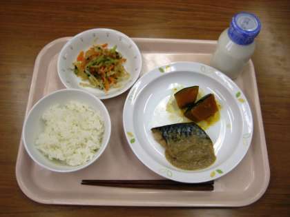 ごはん さばのごまだれかけ かぼちゃの含め煮 糸寒天と野菜の和え物 牛乳