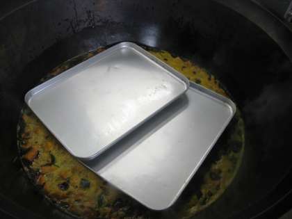 2枚目の写真は、かぼちゃを煮ているところです。バットを落とし蓋にして煮ました。
