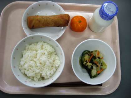 ごはん 春巻き わかめサラダ 冷凍みかん 牛乳