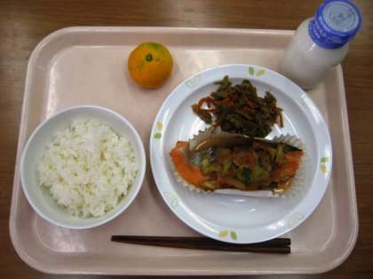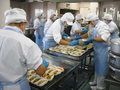 ちゃんちゃん焼きは、北海道の郷土料理で、鉄板に鮭と野菜を乗せて豪快に焼き、みそをかけて作ります。給食では、釜で野菜とみそを炒めて、カップに鮭と炒めた野菜を入れて、スチームコンベクションオーブンで焼き上げます。