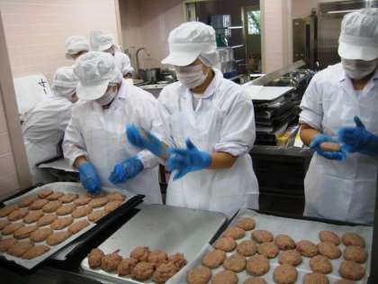 2枚目の写真は、むろあじバーグを作っているところです。むろあじバーグは八丈島のむろあじを使った、魚のハンバーグです。約900個一つ一つ手作りで作りました。