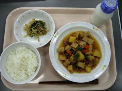 ごはん じゃがいものそぼろ煮 もやしのごま風味 牛乳