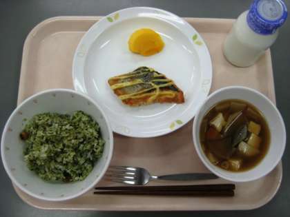 豆ごはん 鮭のみそマヨネーズ焼き けんちん汁 柿