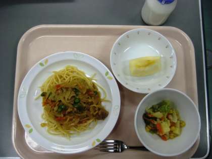 スパゲティカレーソース ポテト入りフレンチサラダ りんご 牛乳