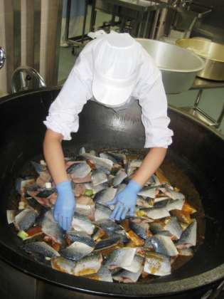 さばのみそ煮は、釜にさば・みそだれ・しょうが・ねぎを並べて煮て作ります。