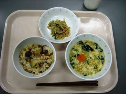吹き寄せごはん かき玉汁 ごま酢かけ 牛乳