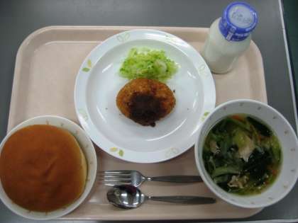 丸パン コロッケ ボイルキャベツ 野菜スープ 牛乳