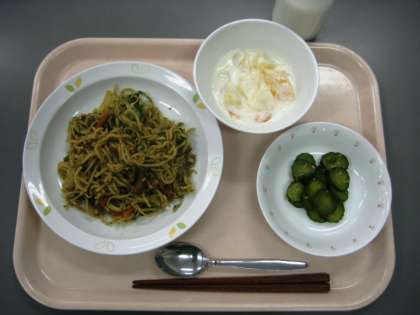 ソース焼きそば きゅうりのちゅうか味 フルーツヨーグルト 牛乳