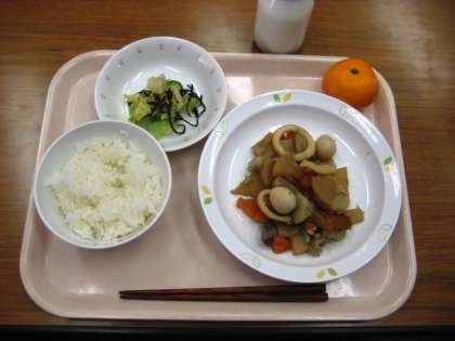 ごはん いかと大根のうまに 野菜のきく花和え みかん 牛乳