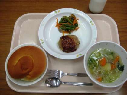 ミルクパン アップルチーズハンバーグ いんげんソテー 野菜スープ 牛乳