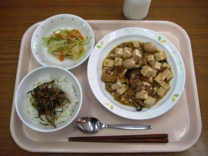 ごはん 小魚のふりかけ 豆腐の五目炒め みそドレッシングサラダ 牛乳