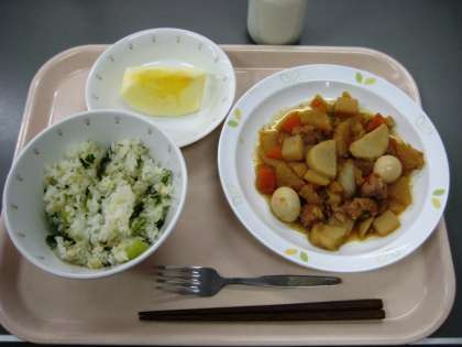 青菜とじゃこのごはん 豚肉と大根のうま煮 りんご 牛乳