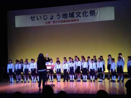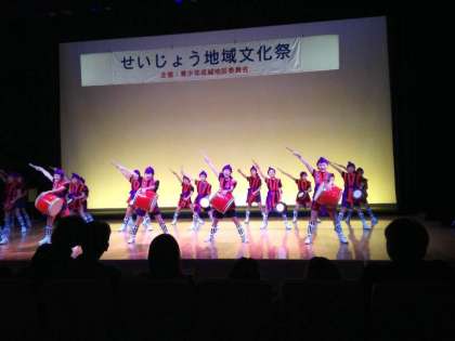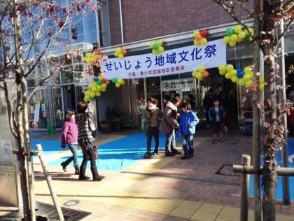 成城ホールを中心に、成城総合支所にて成城文化祭が催されました。赤いエプロンを身に付けた成城地区委員会の皆さんが企画運営しています。成城ホールの舞台では、砧中学校の吹奏楽部や成城の街で活動している様々なグループが、日頃の練習の成果を発表しました。明正小学校からは、エイサー・合唱団をはじめとし、自分たちが活動しているグループに参加し、盛り上げに一役買っていました。中学生のボランティアも砧中の生徒を中心にたくさん参加しました。