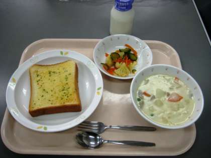 ガーリックトースト クリームシチュー カリフラワーの中華和え 牛乳