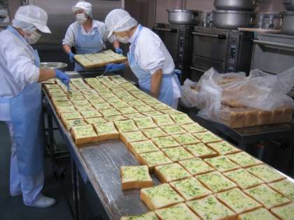 ガーリックトーストは、食パンににんにくパセリバターを塗って、粉チースをふるいかけて焼き上げました。