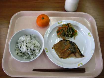 わかめごはん さばのピリ辛ソースかけ 野菜のからししょうゆかけ みかん 牛乳