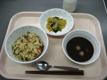 豚肉とごぼうのごはん きのこ入り煮浸し おしるこ 牛乳