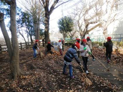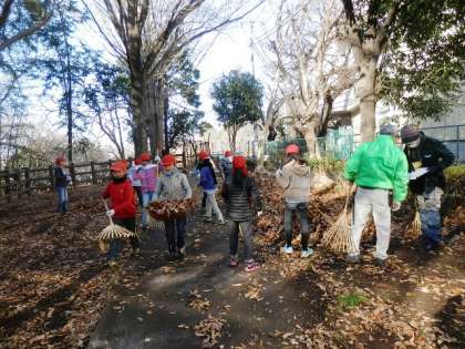 12月に予定していた、里山の落ち葉かきを、里山ボランティアの皆さんと一緒にやりました。里山には、桜などたくさんの落ち葉がたくさんありました。熊手をつかって集め、一か所にまとめます。たくさん運ぼうと思うととても重くって大変でしたが、きれいになっていくのがわかるので、「がんばったな」とみんな思いました。