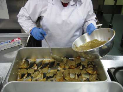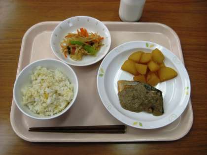 雑穀ごはん さばのごまだれかけ じゃがいもの甘辛煮 野菜のからししょうゆかけ 牛乳