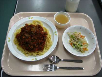 スパゲティミートソース たまねぎドレッシングサラダ りんごゼリー 牛乳