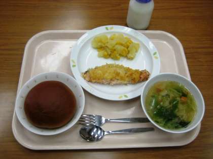 黒砂糖パン 鮭のガーリック焼き コーンポテト 野菜スープ 牛乳