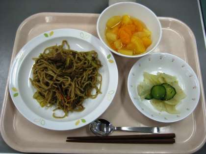 ソースやきそば きゅうりと大根のごま風味 フルーツポンチ 牛乳