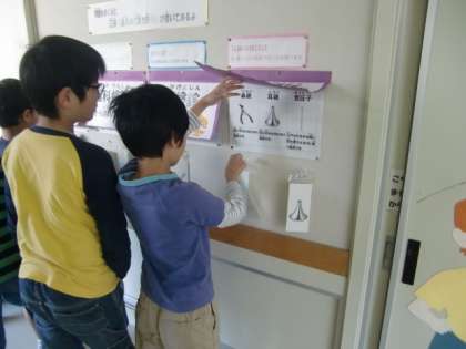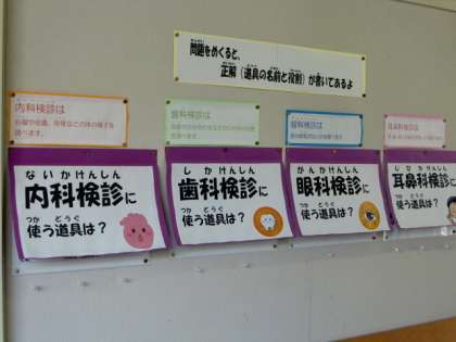 検診の終わった児童が保健室前の掲示物で