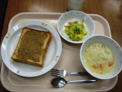 セサミトースト コーンシチュー キャベツサラダ 牛乳