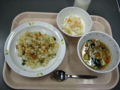 鮭ピラフ コンソメスープ フルーツヨーグルト 牛乳