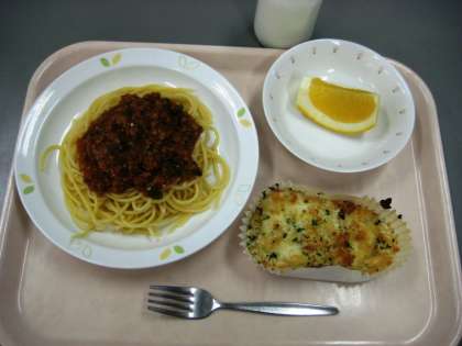 スパゲティ ミートソース ポテトクリーム焼き 牛乳